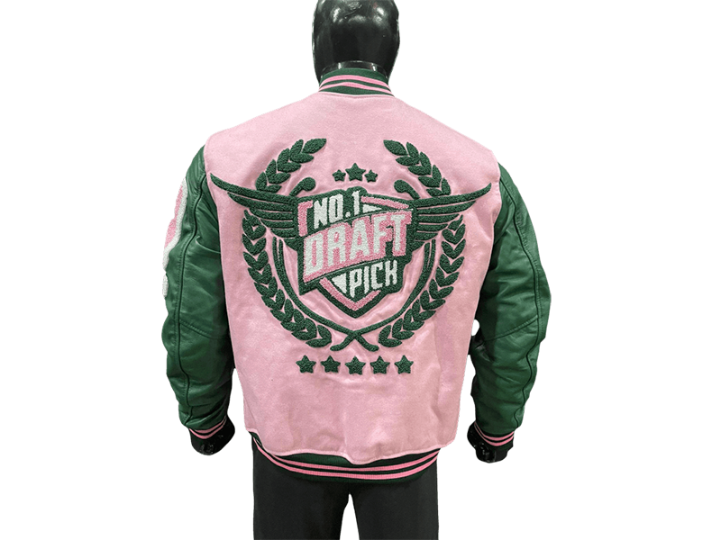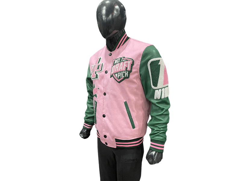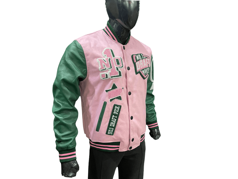 N1DPVSJ-4000-N1DP VARSITY (ALPHA KAPPA PINK/GREEN) WOOL BODY-LAMB SKIN LEATHER SLEEVE